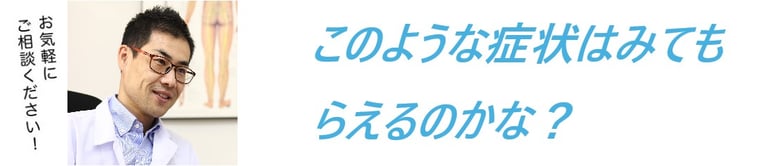 これらは代表的なものですので、記載していない症状で来院していらっしゃる方々も多数おられます。ご質問などはお気軽にお問い合わせください。