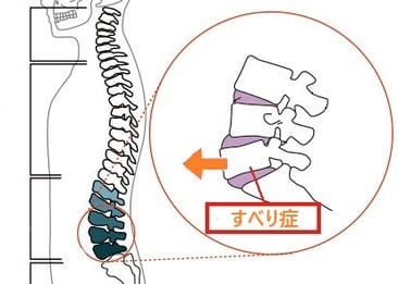 すべり症は、なんらかの原因により、腰の背骨が前方へずれることで起こります。