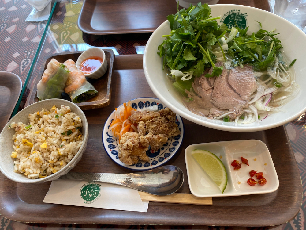 牛肉のふぉーに、炒飯、生春巻き、唐揚げ、がついていて、その名の通り満腹です!