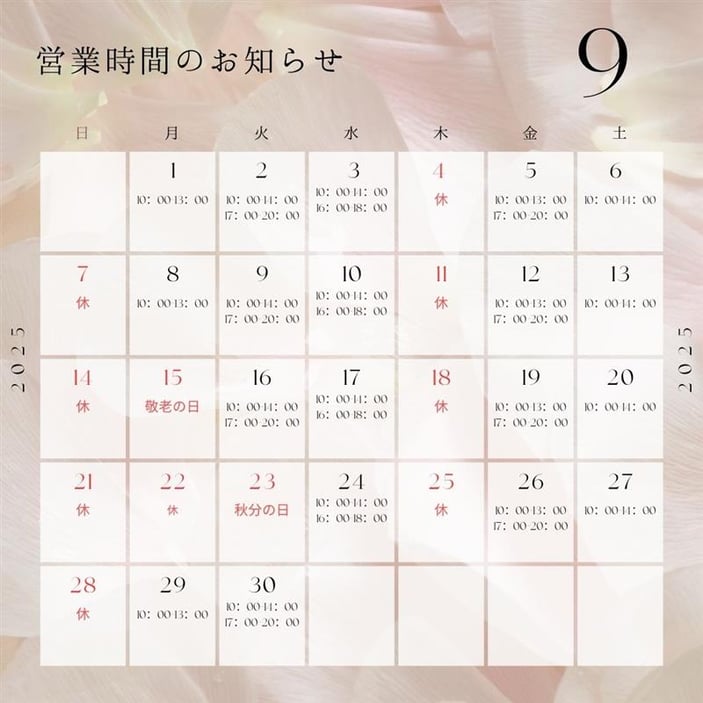 2025年9月のお休みは以下の通りです。