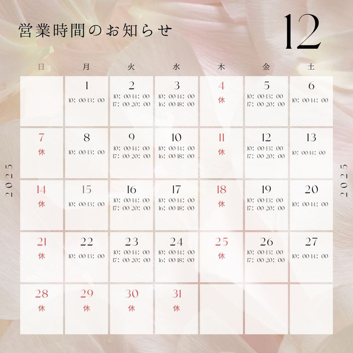 - 12/28(土)より年末年始のお休みとさせていただきます。