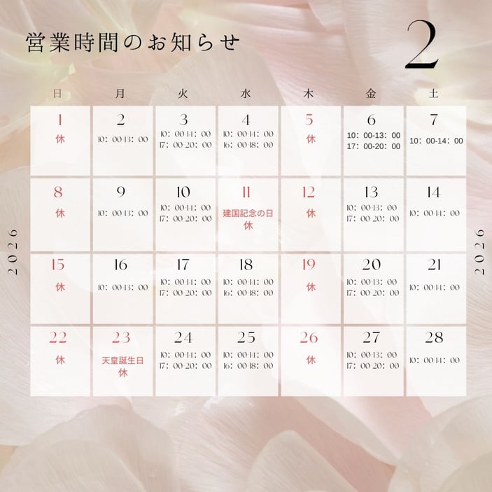 祝日:2月11日(水・建国記念の日)、2月23日(月・天皇誕生日)